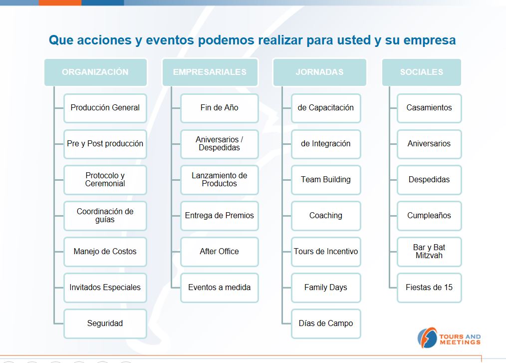 Producción General de Eventos Empresariales y Sociales | Jornadas, Congresos,Capacitaciones | Soluciones en Innovación Tecnológica | Turismo Receptivo / Incentivos | Relaciones Públicas | Equipo de Gerenciamiento de Proyectos