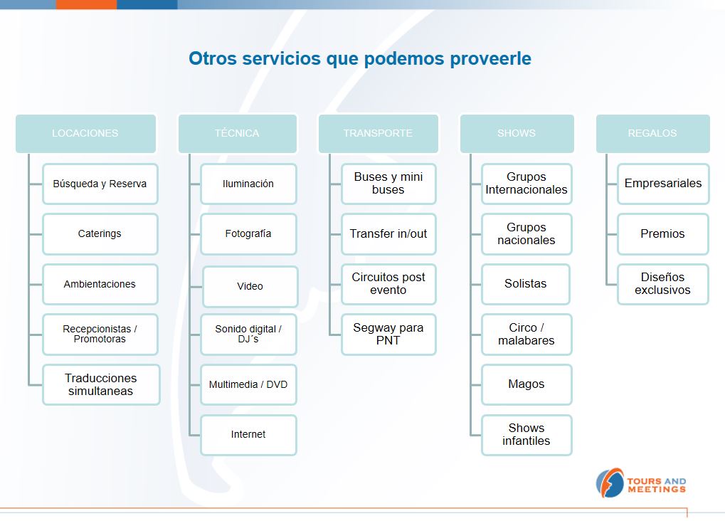 Locaciones, Tecnica, Transportes, Shows, Regalos empresarios. Tambien puede conocer la metodologia que utilizamos.